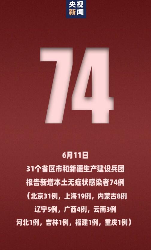31个省(自治区、直辖市)和新疆生产建设兵团报告新增无症状感染者141例,其中境外输入67例,本土74例(北京31例,上海19例,内蒙古8例,辽宁5例,广西4例,云南3例,河北1例,吉林1例,福建1例,重庆1例)。