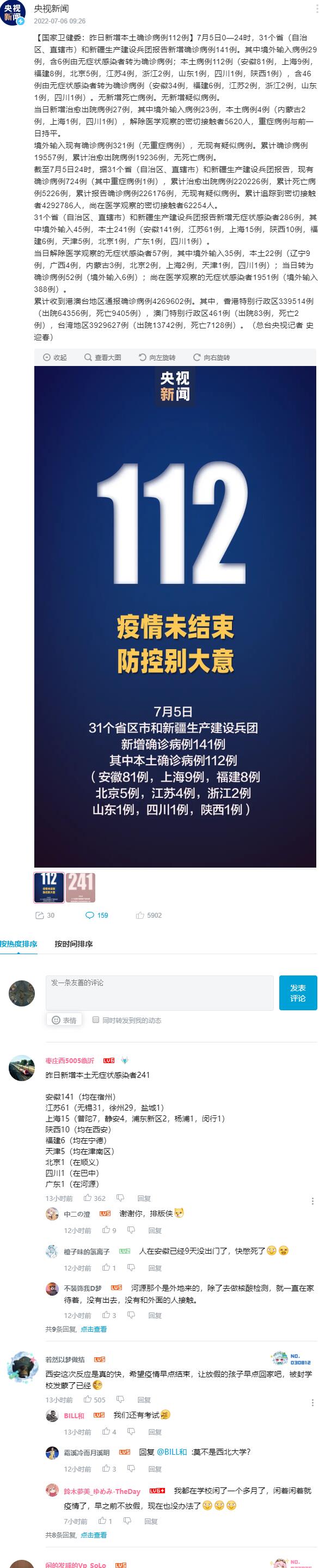 【国家卫健委:昨日新增本土确诊病例112例】7月5日0—24时,31个省(自治区、直辖市)和新疆生产建设兵团报告新增确诊病例141例。其中境外输入病例29例,含6例由无症状感染者转为确诊病例;本土病例112例(安徽81例,上海9例,福建8例,北京5例,江苏4例,浙江2例,山东1例,四川1例,陕西1例),含46例由无症状感染者转为确诊病例(安徽34例,福建6例,江苏2例,浙江2例,山东1例,四川1例)。无新增死亡病例。无新增疑似病例。