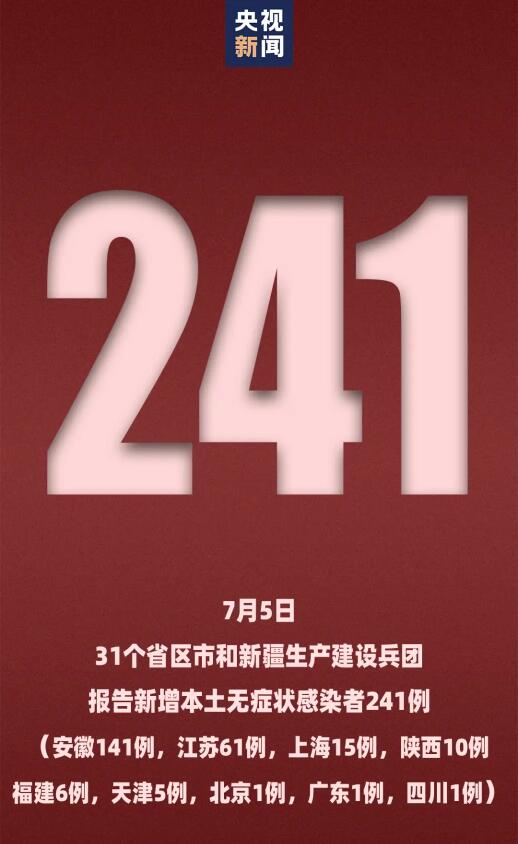 31个省(自治区、直辖市)和新疆生产建设兵团报告新增无症状感染者286例,其中境外输入45例,本土241例(安徽141例,江苏61例,上海15例,陕西10例,福建6例,天津5例,北京1例,广东1例,四川1例)。