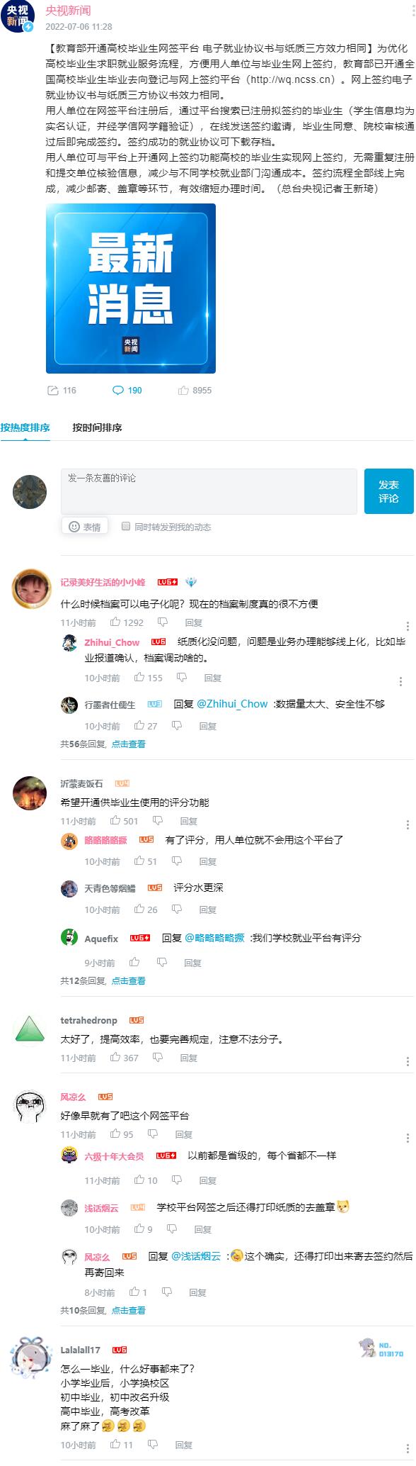 ★★★ 教育部开通高校毕业生网签平台 电子就业协议书与纸质三方效力相同