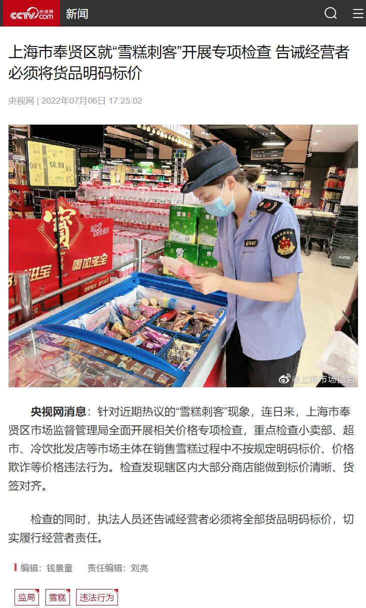 ★★★ 上海市奉贤区就“雪糕刺客”开展专项检查 告诫经营者必须将货品明码标价