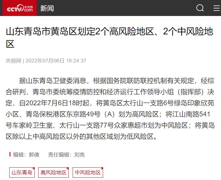 ★★★ 山东青岛市黄岛区划定2个高风险地区、2个中风险地区