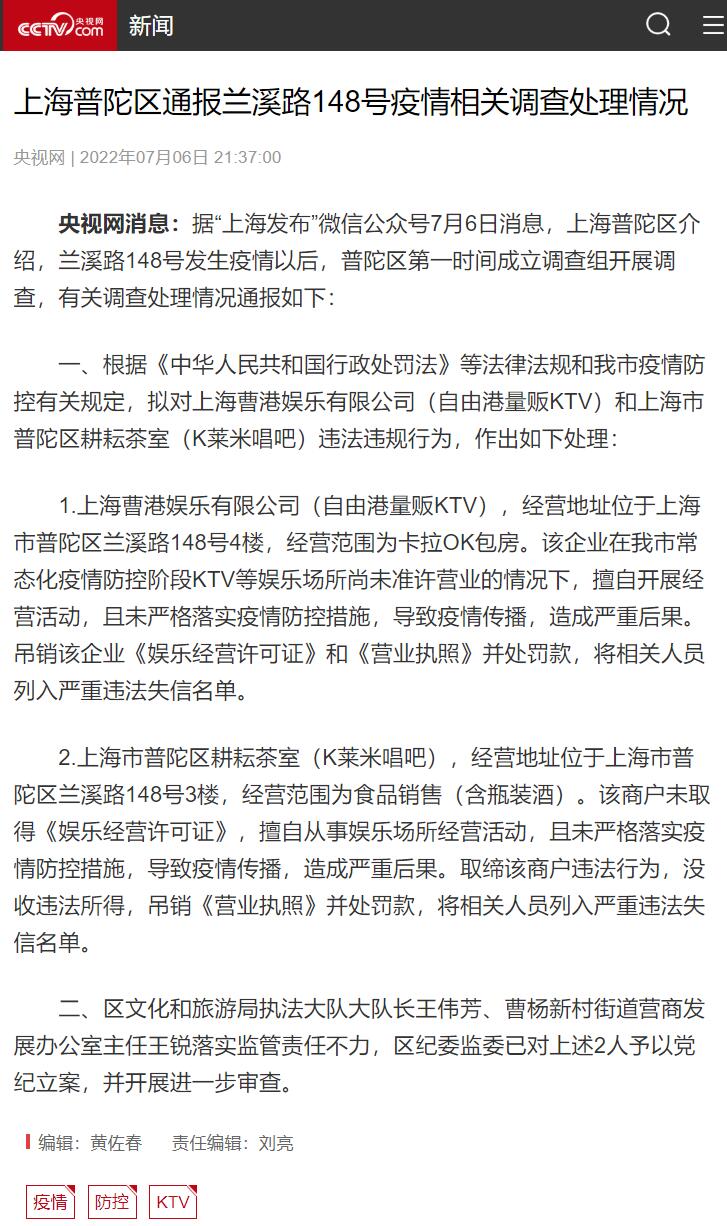 1.上海曹港娱乐有限公司(自由港量贩KTV),经营地址位于上海市普陀区兰溪路148号4楼,经营范围为卡拉OK包房。该企业在我市常态化疫情防控阶段KTV等娱乐场所尚未准许营业的情况下,擅自开展经营活动,且未严格落实疫情防控措施,导致疫情传播,造成严重后果。吊销该企业《娱乐经营许可证》和《营业执照》并处罚款,将相关人员列入严重违法失信名单。
