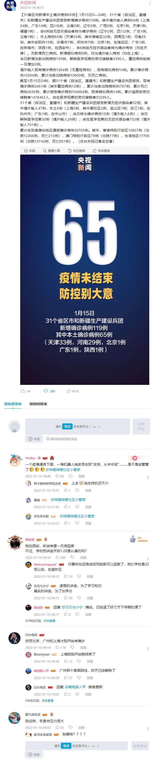 【31省区市新增本土确诊病例65例】1月15日0—24时,31个省(自治区、直辖市)和新疆生产建设兵团报告新增确诊病例119例。其中境外输入病例54例(上海24例,广东14例,四川6例,云南3例,辽宁2例,广西2例,北京1例,天津1例,福建1例),含6例由无症状感染者转为确诊病例(辽宁2例,四川2例,广东1例,云南1例);本土病例65例(天津33例,其中津南区32例、西青区1例;河南29例,其中安阳市15例、许昌市7例、郑州市7例;北京1例,在海淀区;广东1例,在珠海市;陕西1例,在西安市),含6例由无症状感染者转为确诊病例(均在天津)。无新增死亡病例。新增疑似病例9例,均为境外输入病例(均在上海)。