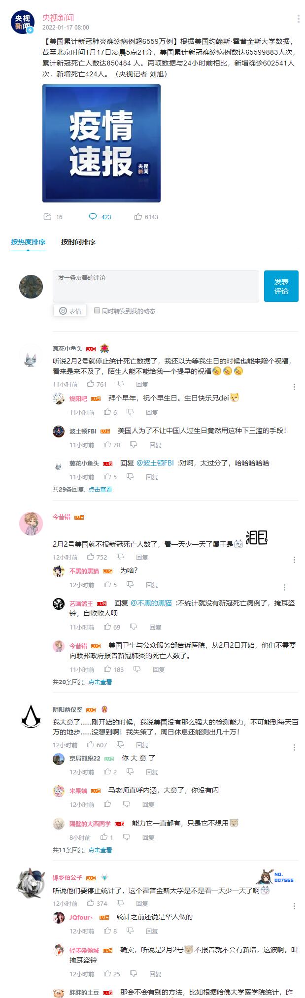 【美国累计新冠肺炎确诊病例超6559万例】根据美国约翰斯·霍普金斯大学数据,截至北京时间1月17日凌晨5点21分,美国累计新冠确诊病例数达65599883人次,累计新冠死亡人数达850484 人。两项数据与24小时前相比,新增确诊602541人次,新增死亡424人。(央视记者 刘旭)