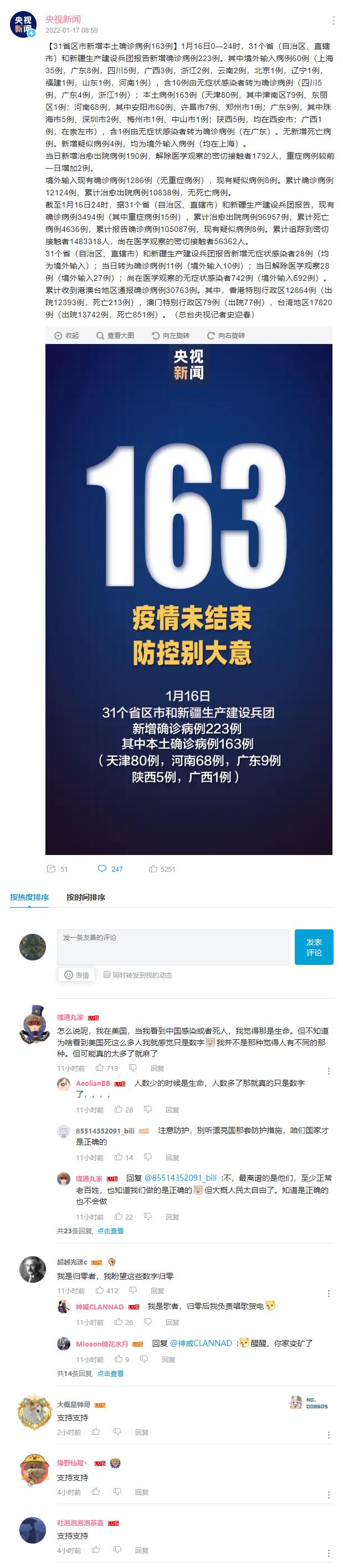 【31省区市新增本土确诊病例163例】1月16日0—24时,31个省(自治区、直辖市)和新疆生产建设兵团报告新增确诊病例223例。其中境外输入病例60例(上海35例,广东8例,四川5例,广西3例,浙江2例,云南2例,北京1例,辽宁1例,福建1例,山东1例,河南1例),含10例由无症状感染者转为确诊病例(四川5例,广东4例,浙江1例);本土病例163例(天津80例,其中津南区79例、东丽区1例;河南68例,其中安阳市60例、许昌市7例、郑州市1例;广东9例,其中珠海市5例、深圳市2例、梅州市1例、中山市1例;陕西5例,均在西安市;广西1例,在崇左市),含1例由无症状感染者转为确诊病例(在广东)。无新增死亡病例。新增疑似病例4例,均为境外输入病例(均在上海)。