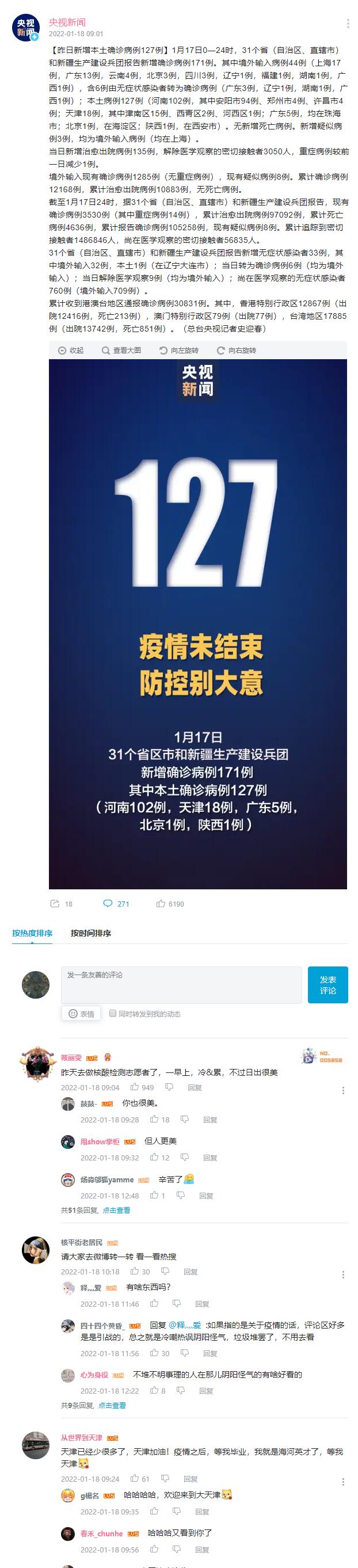 【昨日新增本土确诊病例127例】1月17日0—24时,31个省(自治区、直辖市)和新疆生产建设兵团报告新增确诊病例171例。其中境外输入病例44例(上海17例,广东13例,云南4例,北京3例,四川3例,辽宁1例,福建1例,湖南1例,广西1例),含6例由无症状感染者转为确诊病例(广东3例,辽宁1例,湖南1例,广西1例);本土病例127例(河南102例,其中安阳市94例、郑州市4例、许昌市4例;天津18例,其中津南区15例、西青区2例、河西区1例;广东5例,均在珠海市;北京1例,在海淀区;陕西1例,在西安市)。无新增死亡病例。新增疑似病例3例,均为境外输入病例(均在上海)。
