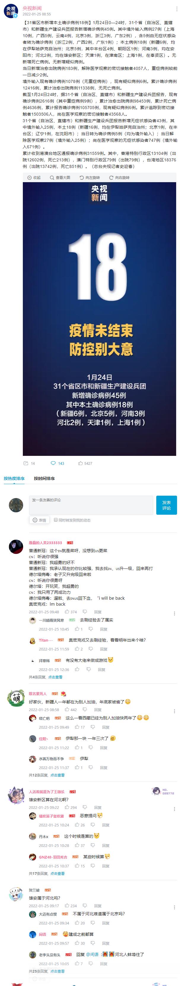 【31省区市新增本土确诊病例18例】1月24日0—24时,31个省(自治区、直辖市)和新疆生产建设兵团报告新增确诊病例45例。其中境外输入病例27例(上海10例,广西5例,云南4例,北京3例,浙江3例,广东2例),含5例由无症状感染者转为确诊病例(浙江2例,广西2例,广东1例);本土病例18例(新疆6例,均在伊犁哈萨克自治州;北京5例,其中丰台区4例、朝阳区1例;河南3例,均在安阳市;河北2例,均在雄安新区;天津1例,在津南区;上海1例,在奉贤区)。无新增死亡病例。无新增疑似病例。
