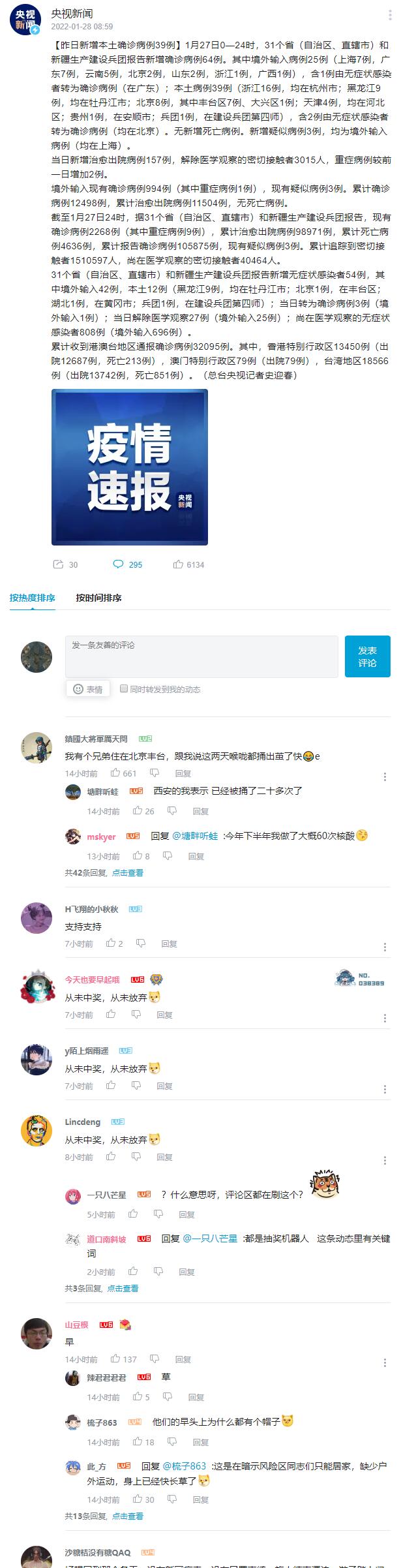 【昨日新增本土确诊病例39例】1月27日0—24时,31个省(自治区、直辖市)和新疆生产建设兵团报告新增确诊病例64例。其中境外输入病例25例(上海7例,广东7例,云南5例,北京2例,山东2例,浙江1例,广西1例),含1例由无症状感染者转为确诊病例(在广东);本土病例39例(浙江16例,均在杭州市;黑龙江9例,均在牡丹江市;北京8例,其中丰台区7例、大兴区1例;天津4例,均在河北区;贵州1例,在安顺市;兵团1例,在建设兵团第四师),含2例由无症状感染者转为确诊病例(均在北京)。无新增死亡病例。新增疑似病例3例,均为境外输入病例(均在上海)。