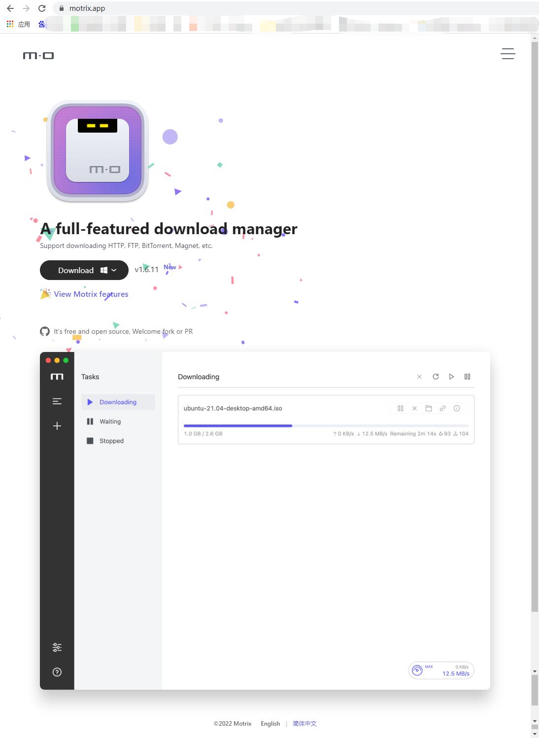 Motrix是一款基于electron开发的跨平台下载软件,核心下载服务还是由aria2c支持,是一款精品的下载工具,支持支持下载 HTTP、FTP、BT、磁力链、百度网盘等资源,是一款不可多得的高颜值下载软件。免费。