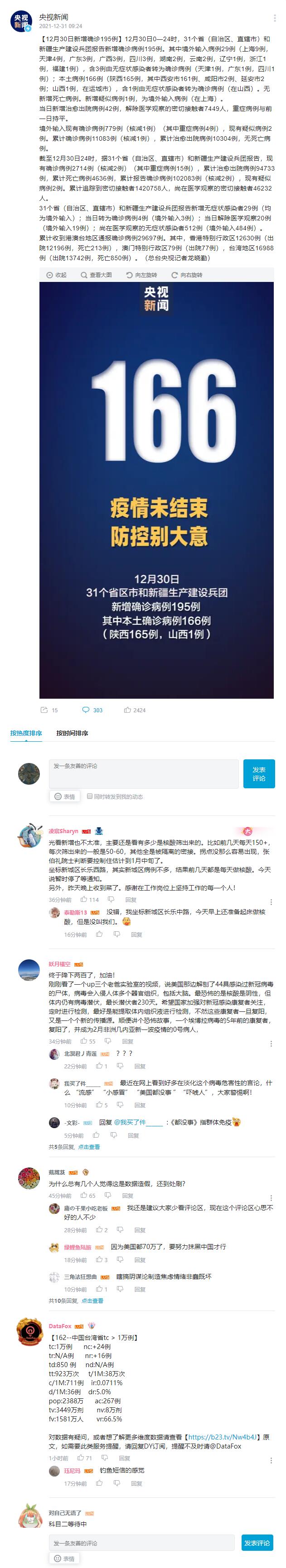 【12月30日新增确诊195例】12月30日0—24时,31个省(自治区、直辖市)和新疆生产建设兵团报告新增确诊病例195例。其中境外输入病例29例(上海9例,天津4例,广东3例,广西3例,四川3例,湖南2例,云南2例,辽宁1例,浙江1例,福建1例),含3例由无症状感染者转为确诊病例(天津1例,广东1例,四川1例);本土病例166例(陕西165例,其中西安市161例、咸阳市2例、延安市2例;山西1例,在运城市),含1例由无症状感染者转为确诊病例(在山西)。无新增死亡病例。新增疑似病例1例,为境外输入病例(在上海)。