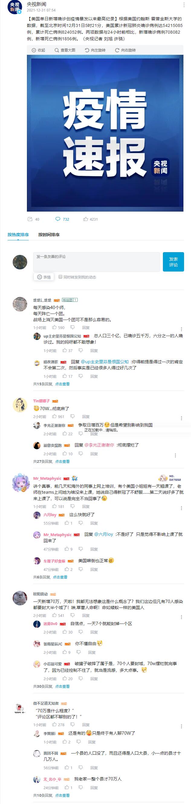 【美国单日新增确诊创疫情暴发以来最高纪录】根据美国约翰斯·霍普金斯大学的数据,截至北京时间12月31日5时21分,美国累计新冠肺炎确诊病例达54215085例,累计死亡病例824052例。两项数据与24小时前相比,新增确诊病例708082例,新增死亡病例1856例。(央视记者 刘旭 许骁)