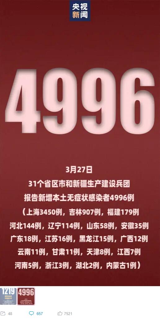 【国家卫健委:昨日新增本土确诊病例1219例】3月27日0—24时,31个省(自治区、直辖市)和新疆生产建设兵团报告新增确诊病例1275例。其中境外输入病例56例(广西14例,四川12例,上海10例,广东6例,吉林4例,浙江3例,福建3例,北京2例,黑龙江1例,河南1例),含15例由无症状感染者转为确诊病例(四川10例,浙江3例,河南1例,广东1例);本土病例1219例(吉林1086例,其中长春市706例、吉林市367例、四平市11例、辽源市1例、松原市1例;上海50例,其中闵行区20例、徐汇区6例、宝山区5例、静安区4例、普陀区4例、浦东新区4例、嘉定区3例、黄浦区2例、虹口区1例、松江区1例;辽宁12例,其中沈阳市5例、葫芦岛市4例、鞍山市2例、营口市1例;黑龙江10例,其中哈尔滨市9例、七台河市1例;福建9例,其中泉州市8例、南平市1例;河南9例,其中周口市8例、漯河市1例;天津8例,其中西青区4例、静海区2例、河西区1例、河北区1例;山东8例,其中泰安市4例、滨州市3例、淄博市1例;河北7例,其中廊坊市3例、唐山市2例、秦皇岛市2例;广东4例,其中肇庆市2例、深圳市1例、东莞市1例;陕西4例,均在安康市;江苏3例,其中泰州市2例、徐州市1例;安徽3例,其中芜湖市1例、淮南市1例、六安市1例;浙江2例,其中嘉兴市1例、台州市1例;江西1例,在南昌市;广西1例,在桂林市;云南1例,在德宏傣族景颇族自治州;甘肃1例,在兰州市),含217例由无症状感染者转为确诊病例(吉林201例,福建4例,陕西4例,山东3例,天津2例,浙江2例,辽宁1例)。无新增死亡病例。新增疑似病例6例,均为境外输入病例(均在上海)。详情↓↓(总台央视记者史迎春)