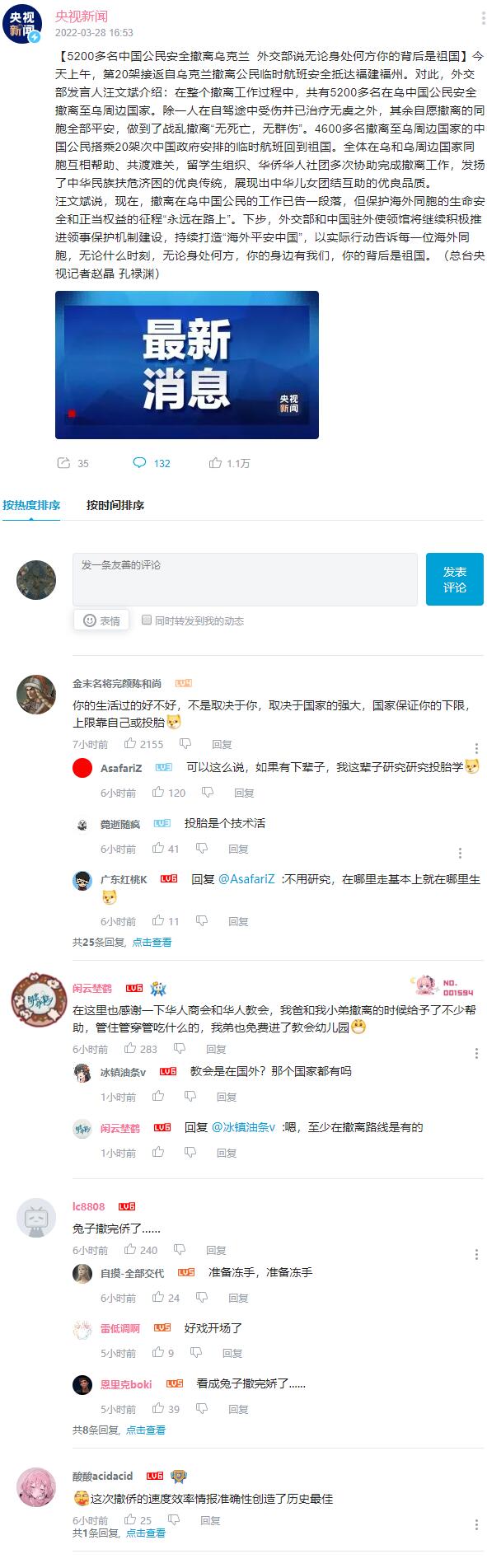 【5200多名中国公民安全撤离乌克兰 外交部说无论身处何方你的背后是祖国】今天上午,第20架接返自乌克兰撤离公民临时航班安全抵达福建福州。对此,外交部发言人汪文斌介绍:在整个撤离工作过程中,共有5200多名在乌中国公民安全撤离至乌周边国家。除一人在自驾途中受伤并已治疗无虞之外,其余自愿撤离的同胞全部平安,做到了战乱撤离“无死亡,无群伤”。4600多名撤离至乌周边国家的中国公民搭乘20架次中国政府安排的临时航班回到祖国。全体在乌和乌周边国家同胞互相帮助、共渡难关,留学生组织、华侨华人社团多次协助完成撤离工作,发扬了中华民族扶危济困的优良传统,展现出中华儿女团结互助的优良品质。