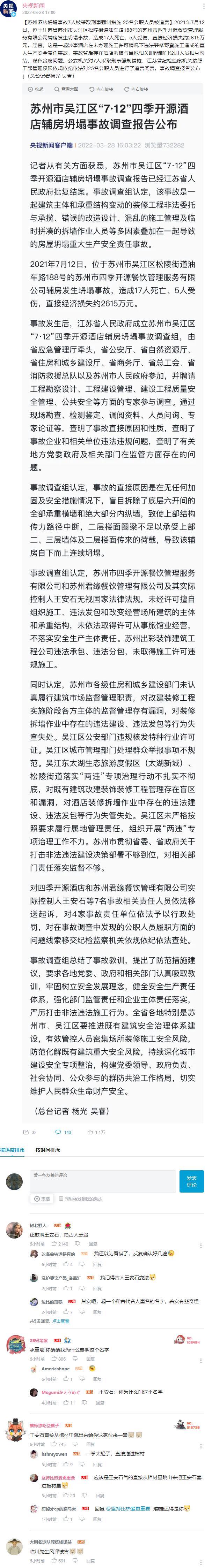 【苏州酒店坍塌事故7人被采取刑事强制措施 25名公职人员被追责】2021年7月12日,位于江苏省苏州市吴江区松陵街道油车路188号的苏州市四季开源餐饮管理服务有限公司辅房发生坍塌事故,造成17人死亡、5人受伤,直接经济损失约2615万元。经查,这是一起涉事酒店在未办理施工许可情况下违法装修野蛮施工造成的重大生产安全责任事故,事故背后存在酒店老板与当地相关职能部门公职人员相互勾结、谋私贪腐问题。公安机关对7人采取刑事强制措施,江苏省纪检监察机关按照干部管理权限依规依纪依法对25名公职人员进行了追责问责。事故调查报告公布↓(总台记者杨光 吴睿)