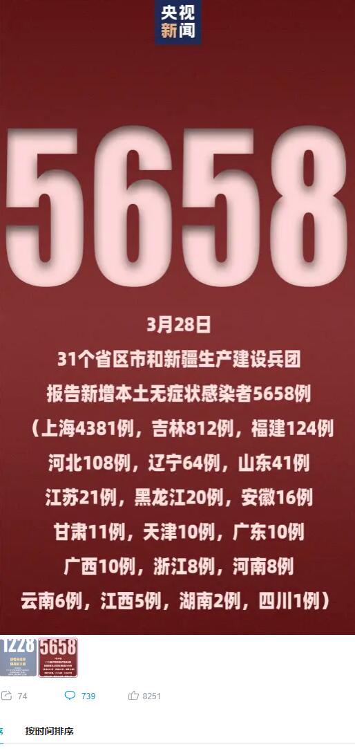 【国家卫健委:昨日新增本土确诊病例1228例】3月28日0—24时,31个省(自治区、直辖市)和新疆生产建设兵团报告新增确诊病例1293例。其中境外输入病例65例,含24例由无症状感染者转为确诊病例;本土病例1228例(吉林1055例,其中长春市622例、吉林市426例、四平市7例;上海96例,其中浦东新区39例、静安区10例、闵行区9例、宝山区8例、长宁区7例、徐汇区6例、虹口区4例、松江区4例、普陀区3例、嘉定区2例、青浦区2例、黄浦区1例、金山区1例;山东12例,其中枣庄市8例、泰安市3例、滨州市1例;辽宁10例,其中沈阳市5例、葫芦岛市3例、鞍山市1例、营口市1例;广东8例,其中深圳市3例、肇庆市3例、茂名市1例、东莞市1例;天津7例,其中西青区3例、河北区2例、河东区1例、东丽区1例;福建7例,均在泉州市;河北6例,其中廊坊市5例、保定市1例;黑龙江5例,其中哈尔滨市4例、大庆市1例;浙江4例,其中杭州市1例、宁波市1例、嘉兴市1例、舟山市1例;山西3例,均在忻州市;江苏3例,其中常州市1例、苏州市1例、泰州市1例;河南3例,其中周口市2例、郑州市1例;湖南3例,均在长沙市;陕西3例,其中安康市2例、宝鸡市1例;安徽2例,其中淮南市1例、宣城市1例;江西1例,在南昌市),含48例由无症状感染者转为确诊病例(上海21例,吉林12例,福建6例,天津4例,山东3例,辽宁1例,浙江1例)。无新增死亡病例。无新增疑似病例。