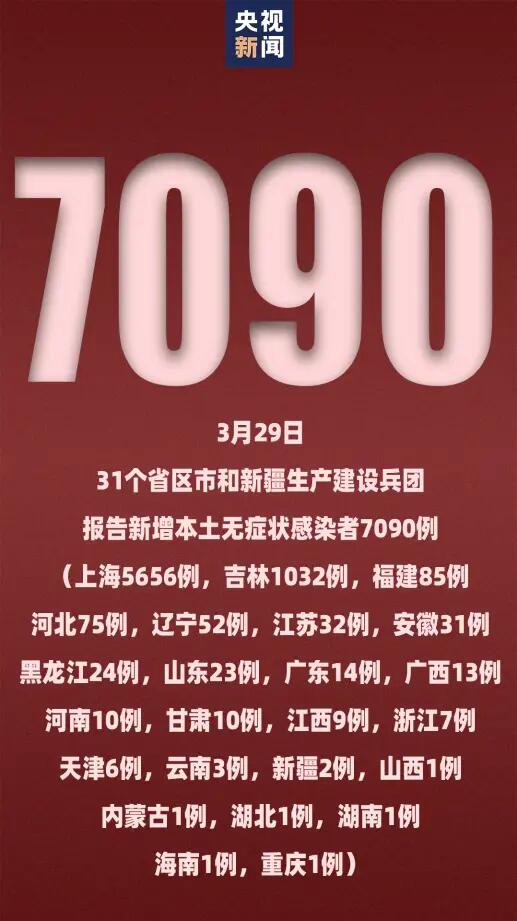【3月29日新增本土确诊1565例 新增本土无症状7090例】3月29日0—24时,31个省(自治区、直辖市)和新疆生产建设兵团报告新增确诊病例1629例。其中境外输入病例64例(四川24例,广东13例,广西9例,云南4例,黑龙江3例,上海3例,福建3例,山西2例,北京1例,内蒙古1例,山东1例),含26例由无症状感染者转为确诊病例(四川20例,广东3例,黑龙江2例,山东1例);本土病例1565例(吉林1150例,其中长春市875例、吉林市268例、四平市7例;上海326例,其中浦东新区169例、徐汇区34例、宝山区33例、闵行区29例、松江区15例、嘉定区9例、静安区8例、虹口区7例、黄浦区6例、普陀区6例、杨浦区3例、长宁区3例、金山区2例、奉贤区1例、崇明区1例;河南26例,均在周口市;黑龙江16例,其中佳木斯市15例、哈尔滨市1例;浙江8例,其中嘉兴市3例、湖州市3例、杭州市1例、丽水市1例;福建7例,其中泉州市6例、莆田市1例;河北6例,其中秦皇岛市3例、廊坊市3例;辽宁5例,其中沈阳市3例、营口市1例、葫芦岛市1例;山东4例,其中青岛市1例、枣庄市1例、泰安市1例、德州市1例;安徽3例,其中淮南市2例、芜湖市1例;湖南3例,其中长沙市2例、娄底市1例;北京2例,均在通州区;天津2例,其中南开区1例、东丽区1例;广东2例,其中深圳市1例、珠海市1例;江苏1例,在泰州市;江西1例,在南昌市;海南1例,在万宁市;重庆1例,在云阳县;贵州1例,在贵阳市),含66例由无症状感染者转为确诊病例(吉林24例,上海18例,黑龙江13例,福建5例,辽宁2例,浙江2例,天津1例,湖南1例)。无新增死亡病例。新增疑似病例2例,均为境外输入病例(均在上海)。