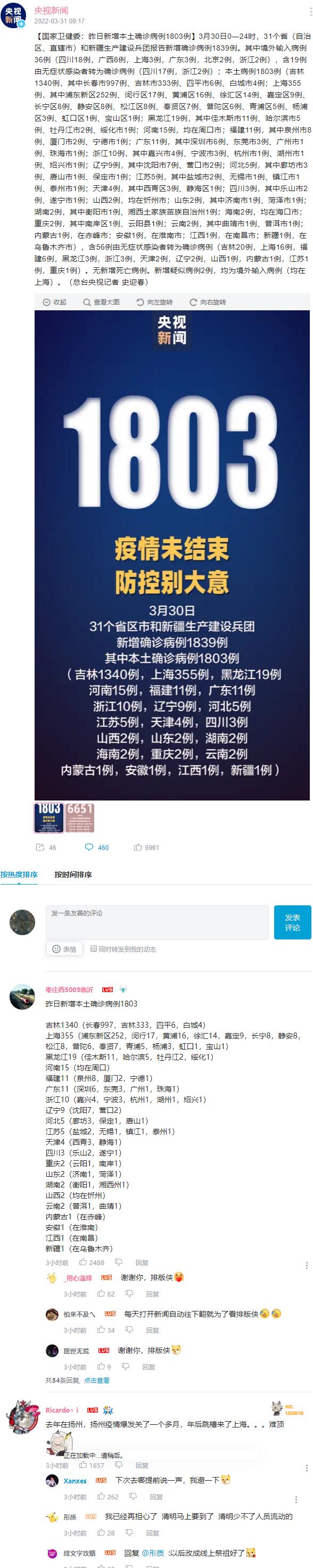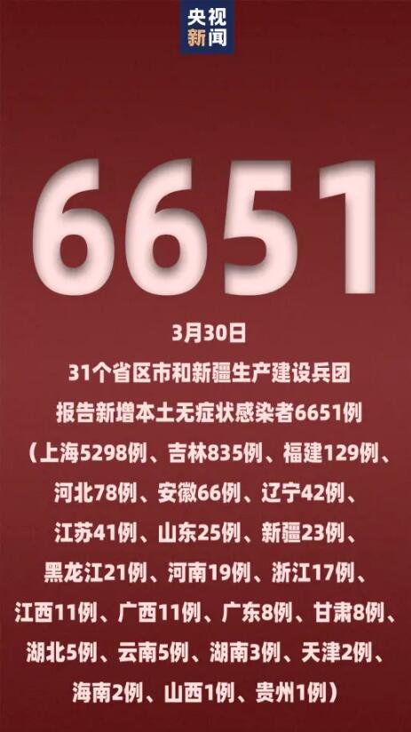 【国家卫健委:昨日新增本土确诊病例1803例】3月30日0—24时,31个省(自治区、直辖市)和新疆生产建设兵团报告新增确诊病例1839例。其中境外输入病例36例(四川18例,广西8例,上海3例,广东3例,北京2例,浙江2例),含19例由无症状感染者转为确诊病例(四川17例,浙江2例);本土病例1803例(吉林1340例,其中长春市997例、吉林市333例、四平市6例、白城市4例;上海355例,其中浦东新区252例、闵行区17例、黄浦区16例、徐汇区14例、嘉定区9例、长宁区8例、静安区8例、松江区8例、奉贤区7例、普陀区6例、青浦区5例、杨浦区3例、虹口区1例、宝山区1例;黑龙江19例,其中佳木斯市11例、哈尔滨市5例、牡丹江市2例、绥化市1例;河南15例,均在周口市;福建11例,其中泉州市8例、厦门市2例、宁德市1例;广东11例,其中深圳市6例、东莞市3例、广州市1例、珠海市1例;浙江10例,其中嘉兴市4例、宁波市3例、杭州市1例、湖州市1例、绍兴市1例;辽宁9例,其中沈阳市7例、营口市2例;河北5例,其中廊坊市3例、唐山市1例、保定市1例;江苏5例,其中盐城市2例、无锡市1例、镇江市1例、泰州市1例;天津4例,其中西青区3例、静海区1例;四川3例,其中乐山市2例、遂宁市1例;山西2例,均在忻州市;山东2例,其中济南市1例、菏泽市1例;湖南2例,其中衡阳市1例、湘西土家族苗族自治州1例;海南2例,均在海口市;重庆2例,其中南岸区1例、云阳县1例;云南2例,其中曲靖市1例、普洱市1例;内蒙古1例,在赤峰市;安徽1例,在淮南市;江西1例,在南昌市;新疆1例,在乌鲁木齐市),含56例由无症状感染者转为确诊病例(吉林20例,上海16例,福建6例,黑龙江3例,浙江3例,天津2例,辽宁2例,山西1例,内蒙古1例,江苏1例,重庆1例)。无新增死亡病例。新增疑似病例2例,均为境外输入病例(均在上海)。(总台央视记者 史迎春)