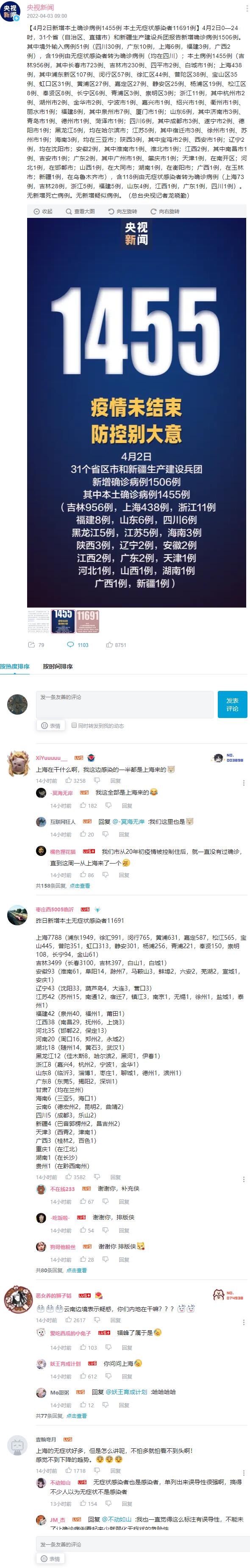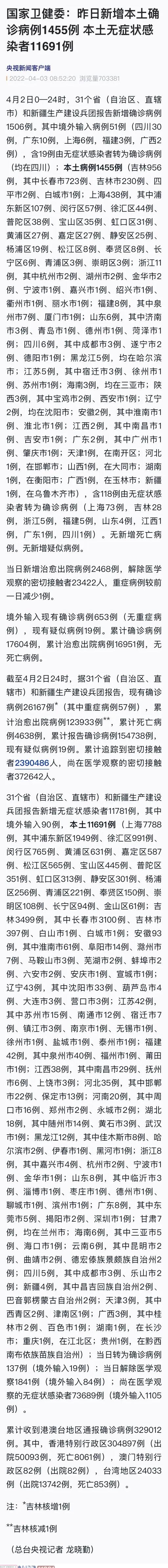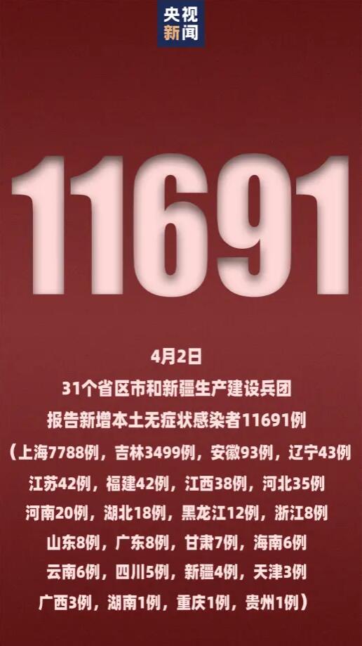 ★★★ 4月2日新增本土确诊病例1455例 本土无症状感染者11691例