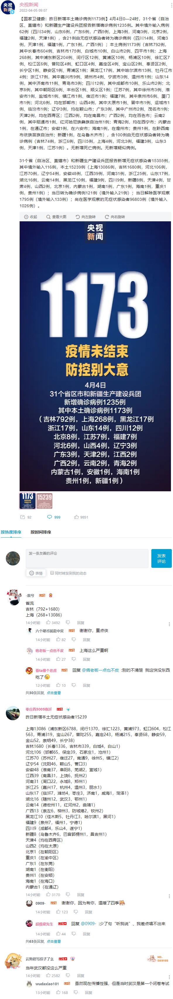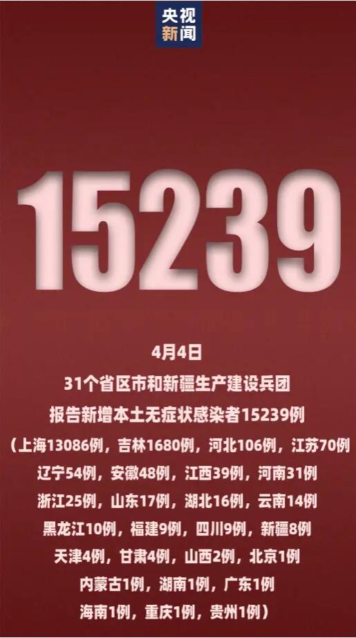 【国家卫健委:昨日新增本土确诊病例1173例】4月4日0—24时,31个省(自治区、直辖市)和新疆生产建设兵团报告新增确诊病例1235例。其中境外输入病例62例(四川34例,山东6例,广东6例,广西5例,上海3例,河南3例,北京2例,福建2例,天津1例),含21例由无症状感染者转为确诊病例(四川14例,河南3例,天津1例,福建1例,广东1例,广西1例);本土病例1173例(吉林792例,其中长春市604例、吉林市175例、白城市10例、白山市2例、四平市1例;上海268例,其中浦东新区204例、闵行区12例、黄浦区10例、杨浦区10例、徐汇区7例、松江区6例、普陀区4例、虹口区4例、嘉定区4例、宝山区2例、奉贤区2例、长宁区1例、静安区1例、青浦区1例;黑龙江17例,其中哈尔滨市13例、牡丹江市4例;浙江17例,其中嘉兴市9例、湖州市4例、宁波市3例、温州市1例;山东14例,其中济南市11例、青岛市3例;四川12例,其中成都市10例、乐山市2例;北京8例,其中朝阳区6例、丰台区1例、顺义区1例;江苏7例,其中徐州市3例、淮安市1例、盐城市1例、镇江市1例、宿迁市1例;福建7例,其中泉州市6例、厦门市1例;河北6例,均在邯郸市;山西4例,其中太原市1例、晋中市1例、运城市1例、临汾市1例;辽宁3例,均在鞍山市;广东3例,其中广州市2例、茂名市1例;天津2例,均在西青区;江西2例,均在南昌市;广西2例,均在百色市;云南2例,其中昭通市1例、红河哈尼族彝族自治州1例;青海2例,均在西宁市;内蒙古1例,在通辽市;安徽1例,在六安市;海南1例,在儋州市;贵州1例,在黔西南布依族苗族自治州;新疆1例,在乌鲁木齐市),含100例由无症状感染者转为确诊病例(吉林74例,浙江6例,四川5例,上海4例,河北3例,福建3例,山东3例,天津1例,江苏1例)。无新增死亡病例。无新增疑似病例。