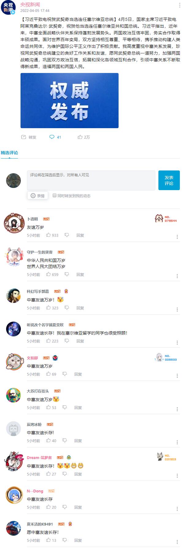 【习近平致电祝贺武契奇当选连任塞尔维亚总统】4月5日,国家主席习近平致电阿莱克桑达尔·武契奇,祝贺他当选连任塞尔维亚共和国总统。习近平指出,近年来,中塞全面战略伙伴关系保持蓬勃发展势头。两国政治互信牢固,务实合作取得丰硕成果。面对世界百年变局,双方坚持相互尊重、平等相待,携手推动构建人类命运共同体,为维护国际公平正义作出了积极贡献。我高度重视中塞关系发展,珍视同武契奇总统建立的良好工作关系和友谊,愿同武契奇总统一道努力,加强两国战略沟通,巩固双方政治互信,拓展和深化各领域互利合作,引领中塞关系不断取得新成果,造福两国和两国人民。