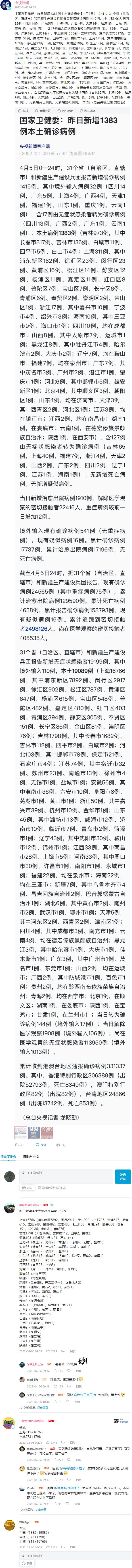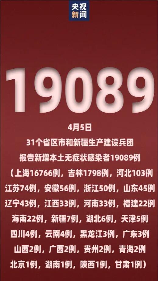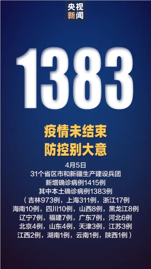 【国家卫健委:昨日新增1383例本土确诊病例】4月5日0—24时,31个省(自治区、直辖市)和新疆生产建设兵团报告新增确诊病例1415例。其中境外输入病例32例(四川14例,广东5例,上海4例,广西4例,天津1例,福建1例,山东1例,重庆1例,云南1例),含17例由无症状感染者转为确诊病例(四川13例,广西2例,广东1例,云南1例);本土病例1383例(吉林973例,其中长春市817例、吉林市136例、白城市11例、四平市5例、白山市4例;上海311例,其中浦东新区162例、徐汇区23例、闵行区23例、黄浦区16例、松江区14例、静安区12例、杨浦区11例、嘉定区11例、虹口区8例、普陀区7例、宝山区7例、长宁区6例、青浦区6例、奉贤区2例、崇明区2例、金山区1例;浙江17例,其中嘉兴市10例、宁波市4例、绍兴市3例;海南10例,其中三亚市9例、海口市1例;四川10例,均在成都市;山西8例,其中太原市7例、运城市1例;黑龙江8例,其中牡丹江市4例、哈尔滨市2例、大庆市2例;辽宁7例,均在鞍山市;福建7例,均在泉州市;广东7例,其中茂名市3例、广州市2例、湛江市1例、肇庆市1例;河北6例,其中邯郸市5例、雄安新区1例;北京4例,其中顺义区3例、朝阳区1例;山东4例,均在济南市;天津3例,其中西青区2例、河北区1例;江苏3例,均在镇江市;江西2例,均在南昌市;湖南1例,在娄底市;云南1例,在德宏傣族景颇族自治州;陕西1例,在西安市),含127例由无症状感染者转为确诊病例(吉林65例,上海40例,福建7例,浙江4例,天津2例,山西2例,广东2例,四川2例,辽宁1例,江苏1例,海南1例)。无新增死亡病例。无新增疑似病例。 详情↓(总台央视记者 龙晓勤)
