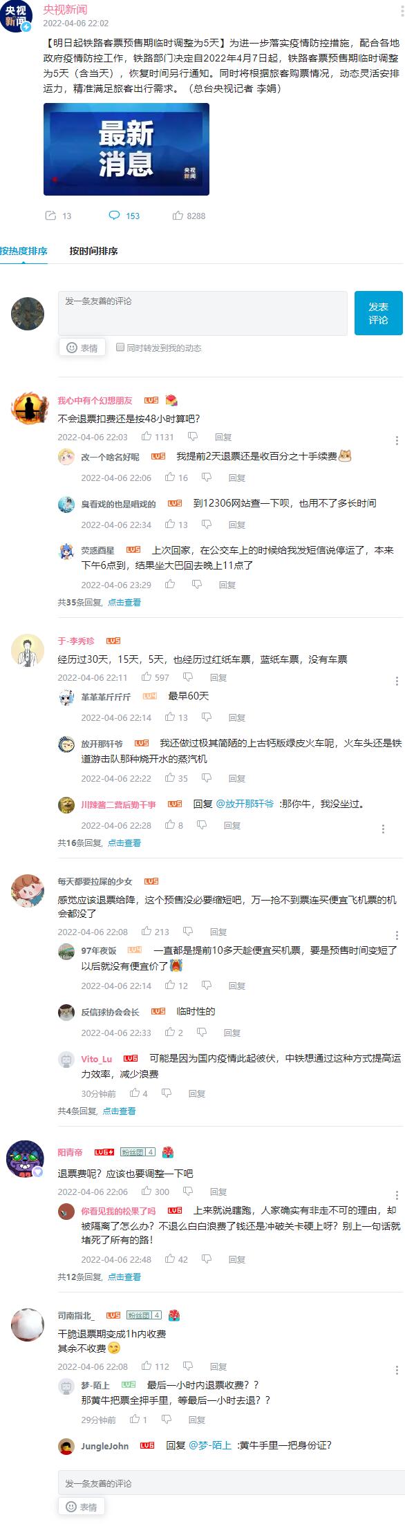 【明日起铁路客票预售期临时调整为5天】为进一步落实疫情防控措施,配合各地政府疫情防控工作,铁路部门决定自2022年4月7日起,铁路客票预售期临时调整为5天(含当天),恢复时间另行通知。同时将根据旅客购票情况,动态灵活安排运力,精准满足旅客出行需求。(总台央视记者 李娟)