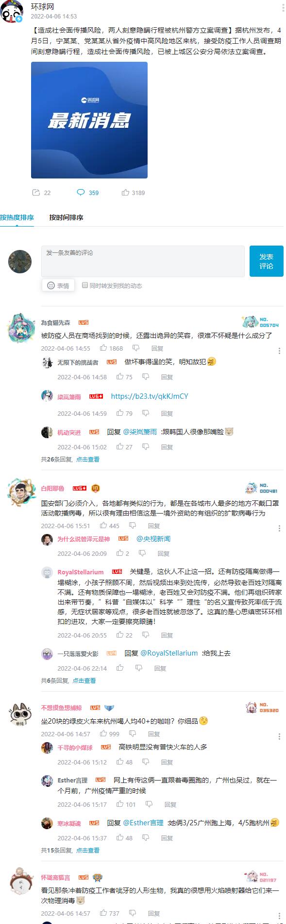 【造成社会面传播风险,两人刻意隐瞒行程被杭州警方立案调查】据杭州发布,4月5日,宁某某、党某某从省外疫情中高风险地区来杭,接受防疫工作人员调查期间刻意隐瞒行程,造成社会面传播风险,已被上城区公安分局依法立案调查。