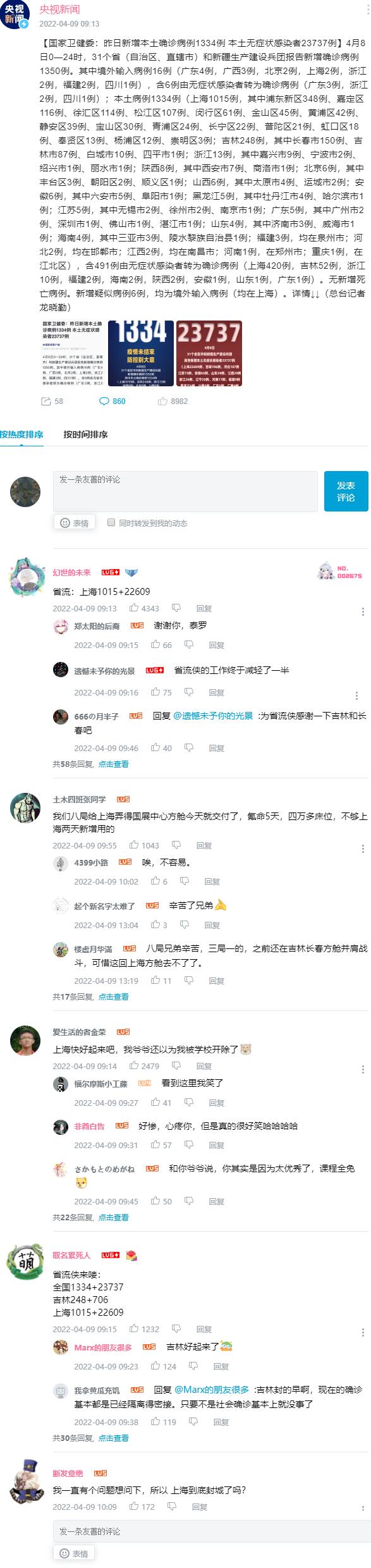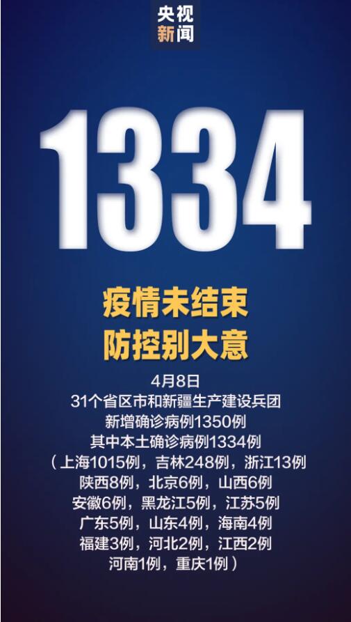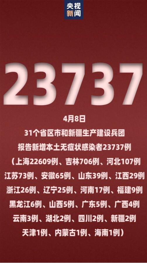 【国家卫健委:昨日新增本土确诊病例1334例 本土无症状感染者23737例】4月8日0—24时,31个省(自治区、直辖市)和新疆生产建设兵团报告新增确诊病例1350例。其中境外输入病例16例(广东4例,广西3例,北京2例,上海2例,浙江2例,福建2例,四川1例),含6例由无症状感染者转为确诊病例(广东3例,浙江2例,四川1例);本土病例1334例(上海1015例,其中浦东新区348例、嘉定区116例、徐汇区114例、松江区107例、闵行区61例、金山区45例、黄浦区42例、静安区39例、宝山区30例、青浦区24例、长宁区22例、普陀区21例、虹口区18例、奉贤区13例、杨浦区12例、崇明区3例;吉林248例,其中长春市150例、吉林市87例、白城市10例、四平市1例;浙江13例,其中嘉兴市9例、宁波市2例、绍兴市1例、丽水市1例;陕西8例,其中西安市7例、商洛市1例;北京6例,其中丰台区3例、朝阳区2例、顺义区1例;山西6例,其中太原市4例、运城市2例;安徽6例,其中六安市5例、阜阳市1例;黑龙江5例,其中牡丹江市4例、哈尔滨市1例;江苏5例,其中无锡市2例、徐州市2例、南京市1例;广东5例,其中广州市2例、深圳市1例、佛山市1例、湛江市1例;山东4例,其中济南市3例、威海市1例;海南4例,其中三亚市3例、陵水黎族自治县1例;福建3例,均在泉州市;河北2例,均在邯郸市;江西2例,均在南昌市;河南1例,在郑州市;重庆1例,在江北区),含491例由无症状感染者转为确诊病例(上海420例,吉林52例,浙江10例,福建2例,海南2例,陕西2例,安徽1例,山东1例,广东1例)。无新增死亡病例。新增疑似病例6例,均为境外输入病例(均在上海)。详情↓↓(总台记者 龙晓勤)