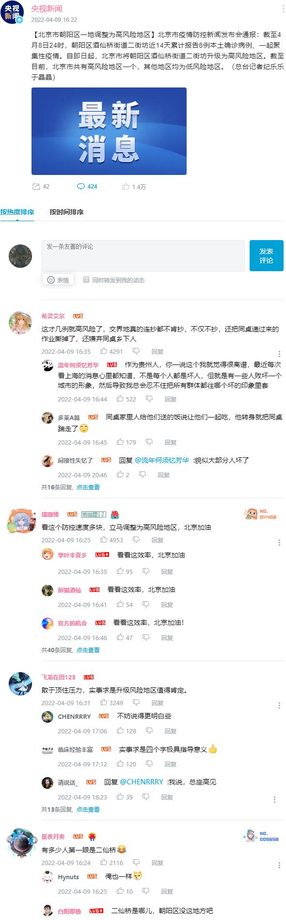 【北京市朝阳区一地调整为高风险地区】北京市疫情防控新闻发布会通报:截至4月8日24时,朝阳区酒仙桥街道二街坊近14天累计报告8例本土确诊病例、一起聚集性疫情。自即日起,北京市将朝阳区酒仙桥街道二街坊升级为高风险地区。截至目前,北京市共有高风险地区一个,其他地区均为低风险地区。(总台记者纪乐乐 于晶晶)