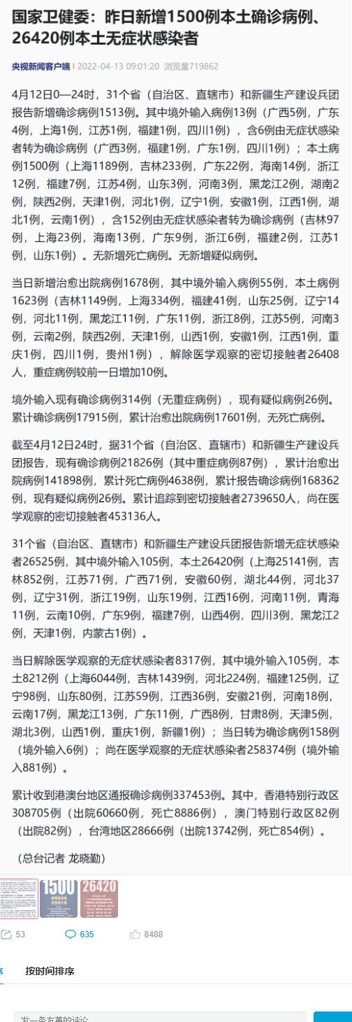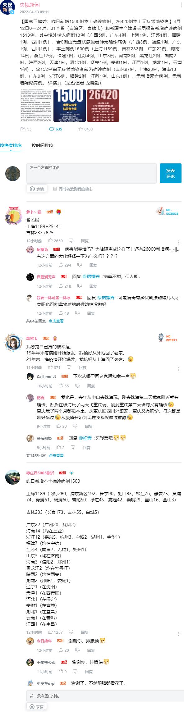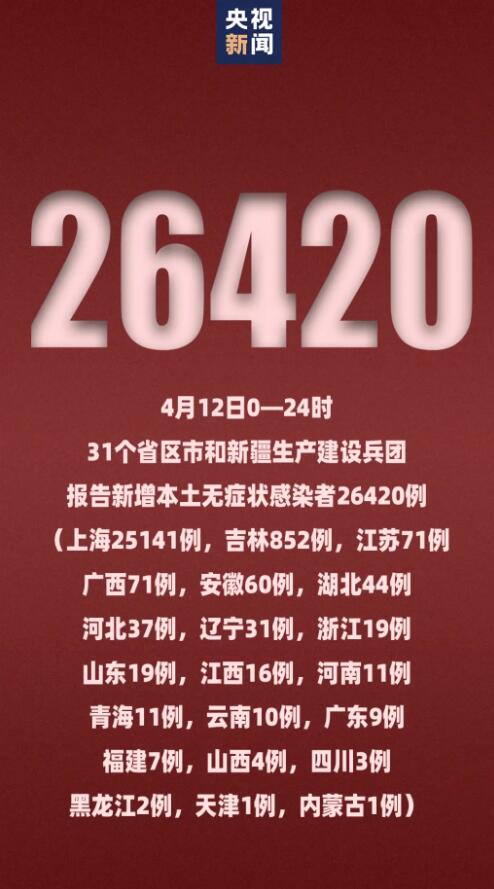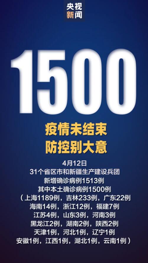 【国家卫健委:昨日新增1500例本土确诊病例、26420例本土无症状感染者】4月12日0—24时,31个省(自治区、直辖市)和新疆生产建设兵团报告新增确诊病例1513例。其中境外输入病例13例(广西5例,广东4例,上海1例,江苏1例,福建1例,四川1例),含6例由无症状感染者转为确诊病例(广西3例,福建1例,广东1例,四川1例);本土病例1500例(上海1189例,吉林233例,广东22例,海南14例,浙江12例,福建7例,江苏4例,山东3例,河南3例,黑龙江2例,湖南2例,陕西2例,天津1例,河北1例,辽宁1例,安徽1例,江西1例,湖北1例,云南1例),含152例由无症状感染者转为确诊病例(吉林97例,上海23例,海南13例,广东9例,浙江6例,福建2例,江苏1例,山东1例)。无新增死亡病例。无新增疑似病例。 详情↓↓(总台记者 龙晓勤)