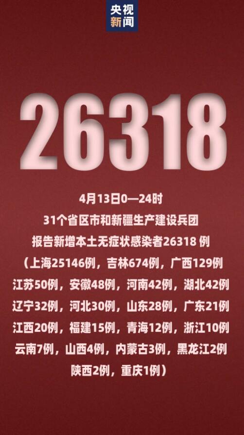 【4月13日新增本土确诊2999例 新增本土无症状26318例】4月13日0—24时,31个省(自治区、直辖市)和新疆生产建设兵团报告新增确诊病例3020例。其中境外输入病例21例(广西6例,四川5例,福建4例,云南3例,北京1例,江苏1例,广东1例),含3例由无症状感染者转为确诊病例(四川2例,福建1例);本土病例2999例(上海2573例,吉林325例,广东47例,浙江9例,福建9例,黑龙江7例,山西4例,河南4例,江苏3例,海南3例,云南3例,河北2例,安徽2例,陕西2例,青海2例,北京1例,辽宁1例,江西1例,山东1例),含344例由无症状感染者转为确诊病例(吉林214例,上海114例,福建6例,浙江4例,海南3例,广东2例,河北1例)。无新增死亡病例。无新增疑似病例。