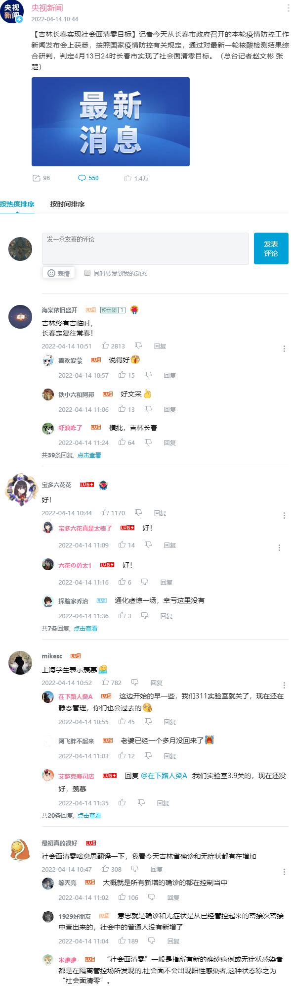 【吉林长春实现社会面清零目标】记者今天从长春市政府召开的本轮疫情防控工作新闻发布会上获悉,按照国家疫情防控有关规定,通过对最新一轮核酸检测结果综合研判,判定4月13日24时长春市实现了社会面清零目标。(总台记者赵文彬 张楚)