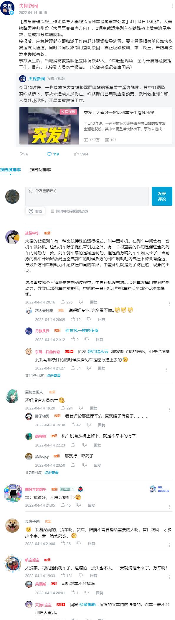 【应急管理部派工作组指导大秦线货运列车追尾事故处置】4月14日13时许,大秦铁路天津蓟州段(大同至秦皇岛方向),2辆重载运煤列车在铁路桥上发生追尾事故,造成部分车厢脱轨。