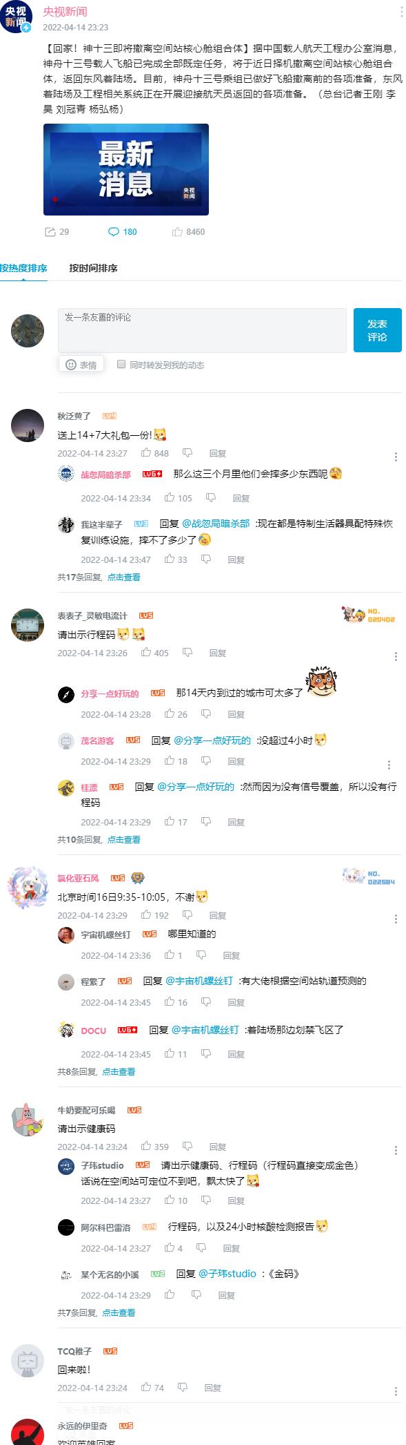 【回家!神十三即将撤离空间站核心舱组合体】据中国载人航天工程办公室消息,神舟十三号载人飞船已完成全部既定任务,将于近日择机撤离空间站核心舱组合体,返回东风着陆场。目前,神舟十三号乘组已做好飞船撤离前的各项准备,东风着陆场及工程相关系统正在开展迎接航天员返回的各项准备。(总台记者王刚 李昊 刘冠青 杨弘杨)