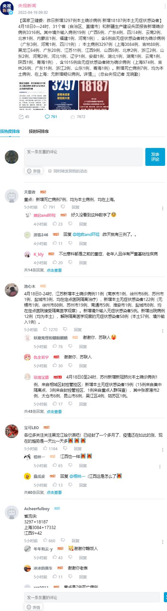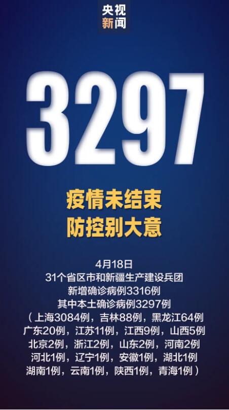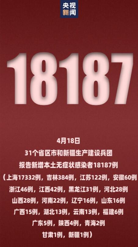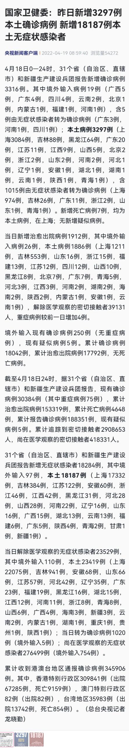 【国家卫健委:昨日新增3297例本土确诊病例 新增18187例本土无症状感染者】4月18日0—24时,31个省(自治区、直辖市)和新疆生产建设兵团报告新增确诊病例3316例。其中境外输入病例19例(广西5例,广东4例,四川4例,云南2例,北京1例,内蒙古1例,福建1例,河南1例),含5例由无症状感染者转为确诊病例(广东3例,河南1例,四川1例);本土病例3297例(上海3084例,吉林88例,黑龙江64例,广东20例,江苏11例,江西9例,山西5例,北京2例,浙江2例,山东2例,河南2例,河北1例,辽宁1例,安徽1例,湖北1例,湖南1例,云南1例,陕西1例,青海1例),含1015例由无症状感染者转为确诊病例(上海974例,吉林26例,广东11例,浙江2例,山东1例,青海1例)。新增死亡病例7例,均为本土病例,在上海;无新增疑似病例。详情↓↓(总台央视记者 龙晓勤)