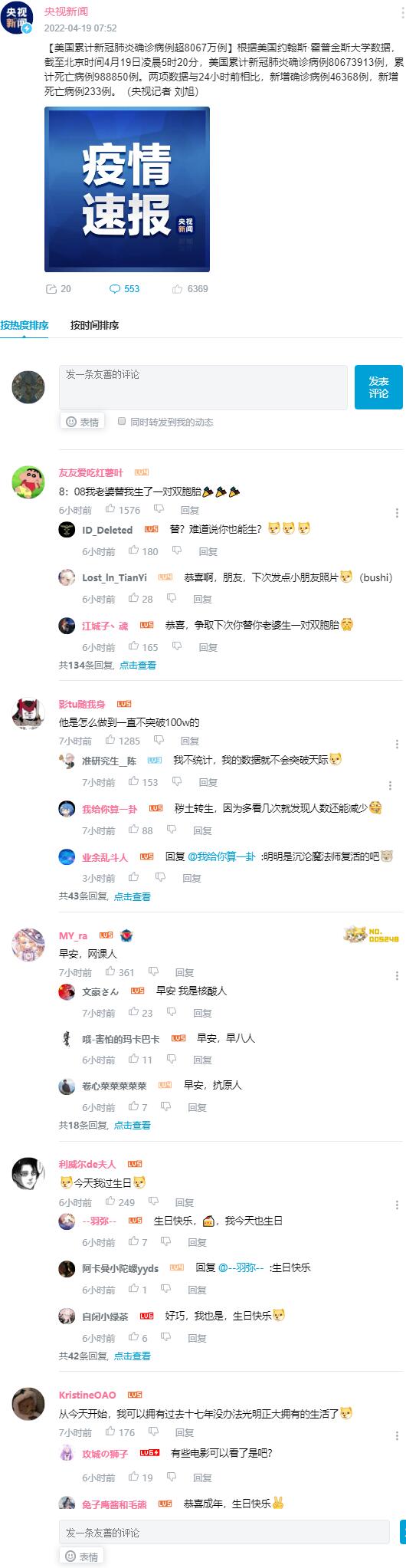 【美国累计新冠肺炎确诊病例超8067万例】根据美国约翰斯·霍普金斯大学数据,截至北京时间4月19日凌晨5时20分,美国累计新冠肺炎确诊病例80673913例,累计死亡病例988850例。两项数据与24小时前相比,新增确诊病例46368例,新增死亡病例233例。(央视记者 刘旭)