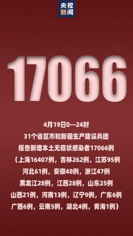 31个省(自治区、直辖市)和新疆生产建设兵团报告新增无症状感染者17166例,其中境外输入100例,本土17066例(上海16407例,吉林262例,江苏95例,河北61例,安徽48例,浙江47例,黑龙江28例,江西28例,山东25例,山西21例,河南13例,辽宁9例,广东6例,广西6例,云南5例,湖北4例,青海1例)。