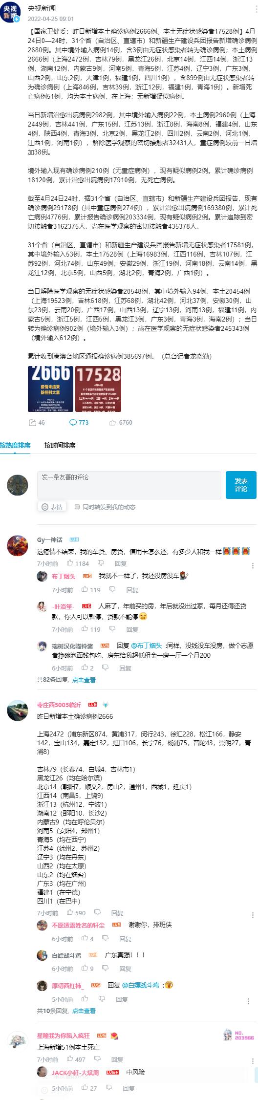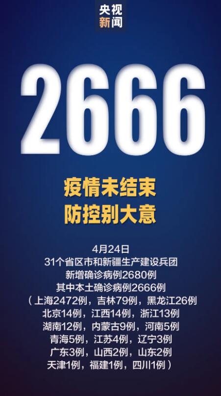 【国家卫健委:昨日新增本土确诊病例2666例、本土无症状感染者17528例】4月24日0—24时,31个省(自治区、直辖市)和新疆生产建设兵团报告新增确诊病例2680例。其中境外输入病例14例,含3例由无症状感染者转为确诊病例;本土病例2666例(上海2472例,吉林79例,黑龙江26例,北京14例,江西14例,浙江13例,湖南12例,内蒙古9例,河南5例,青海5例,江苏4例,辽宁3例,广东3例,山西2例,山东2例,天津1例,福建1例,四川1例),含899例由无症状感染者转为确诊病例(上海846例,吉林39例,浙江12例,福建1例,青海1例)。新增死亡病例51例,均为本土病例,在上海;无新增疑似病例。