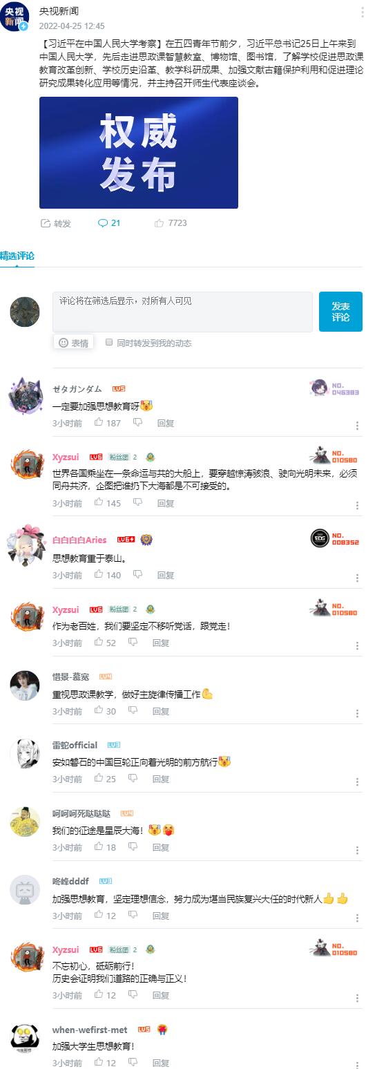 【习近平在中国人民大学考察】在五四青年节前夕,习近平总书记25日上午来到中国人民大学,先后走进思政课智慧教室、博物馆、图书馆,了解学校促进思政课教育改革创新、学校历史沿革、教学科研成果、加强文献古籍保护利用和促进理论研究成果转化应用等情况,并主持召开师生代表座谈会。