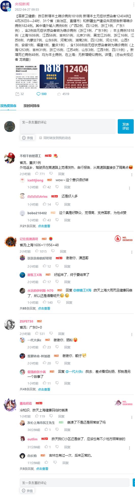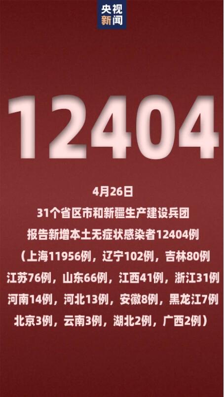 【国家卫健委:昨日新增本土确诊病例1818例 新增本土无症状感染者12404例】4月26日0—24时,31个省(自治区、直辖市)和新疆生产建设兵团报告新增确诊病例1824例。其中境外输入病例6例(广西2例,四川2例,浙江1例,广东1例),含2例由无症状感染者转为确诊病例(浙江1例,广东1例);本土病例1818例(上海1606例,江西56例,吉林51例,北京31例,黑龙江25例,浙江16例,江苏8例,内蒙古7例,山东6例,河南3例,湖南2例,四川2例,河北1例,山西1例,安徽1例,福建1例,重庆1例),含1308例由无症状感染者转为确诊病例(上海1253例,吉林31例,浙江15例,江苏4例,山东3例,江西1例,四川1例)。新增死亡病例48例,均为本土病例,在上海;无新增疑似病例。详情↓(总台央视记者 龙晓勤)