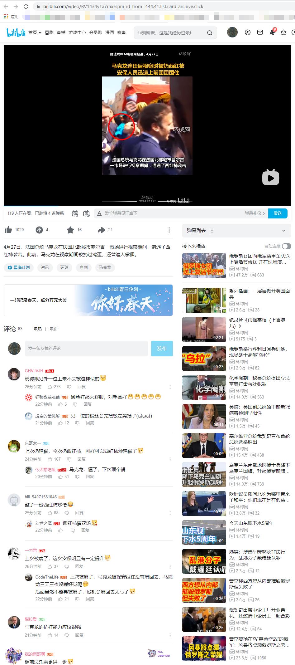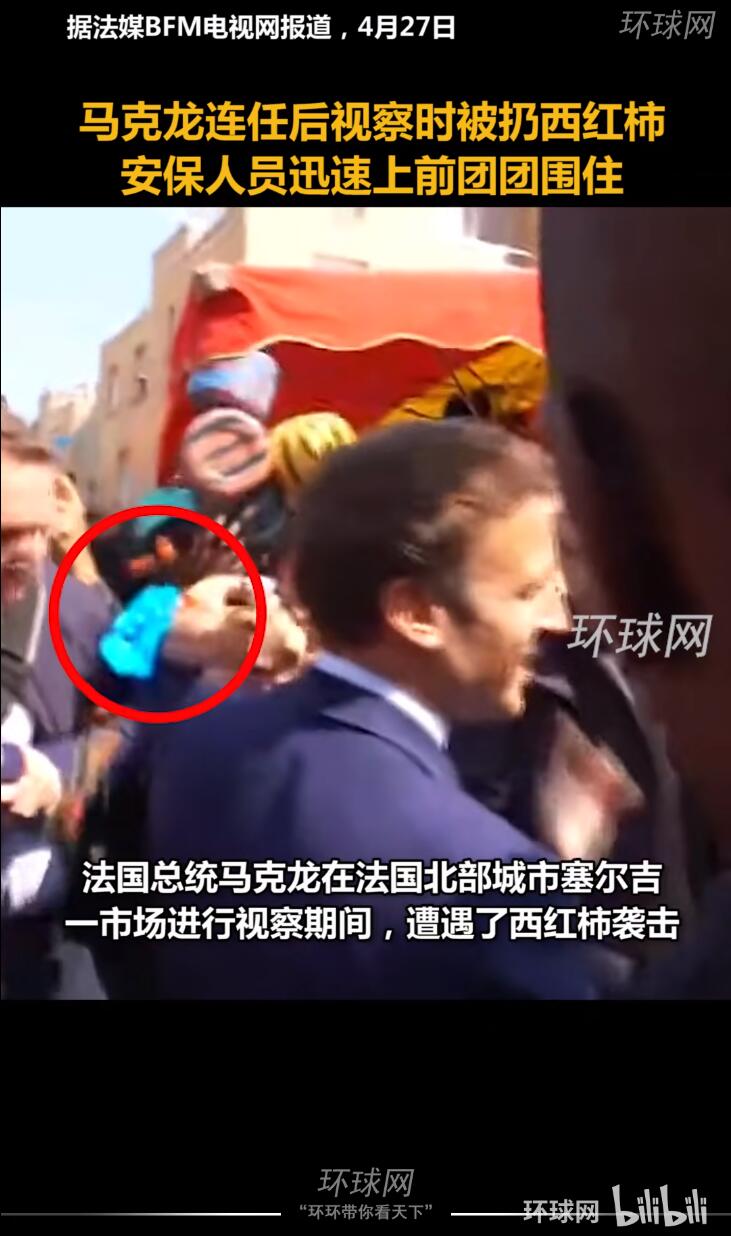 4月27日,法国总统马克龙在法国北部城市塞尔吉一市场进行视察期间,遭遇了西红柿袭击。此前,马克龙在视察期间被扔过鸡蛋,还曾遭人掌掴。