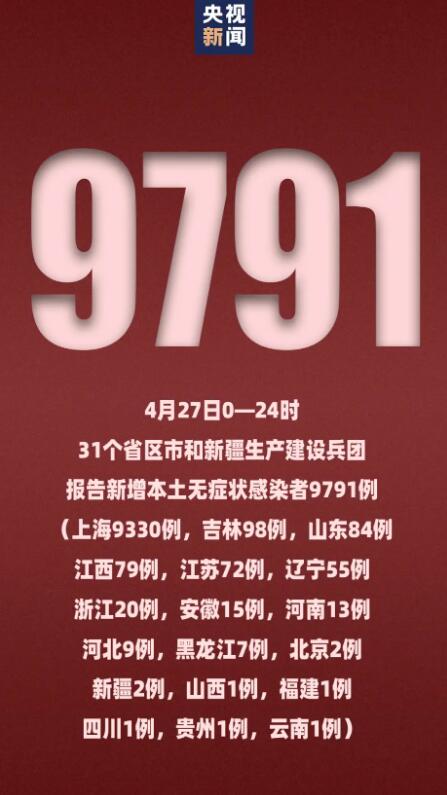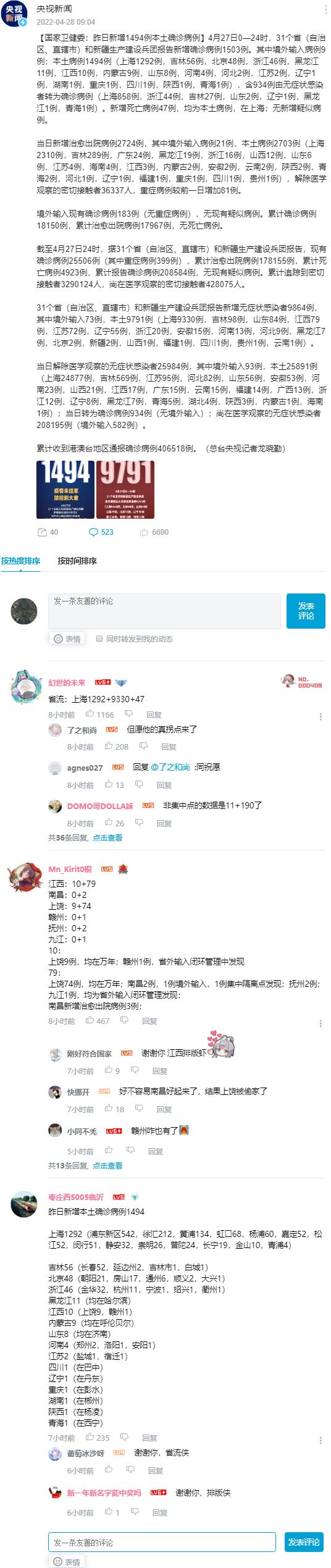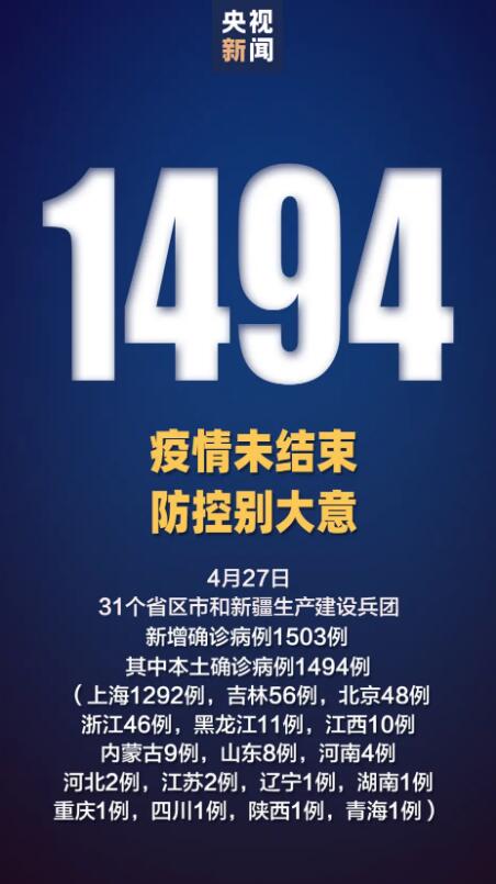 【国家卫健委:昨日新增1494例本土确诊病例】4月27日0—24时,31个省(自治区、直辖市)和新疆生产建设兵团报告新增确诊病例1503例。其中境外输入病例9例;本土病例1494例(上海1292例,吉林56例,北京48例,浙江46例,黑龙江11例,江西10例,内蒙古9例,山东8例,河南4例,河北2例,江苏2例,辽宁1例,湖南1例,重庆1例,四川1例,陕西1例,青海1例),含934例由无症状感染者转为确诊病例(上海858例,浙江44例,吉林27例,山东2例,辽宁1例,黑龙江1例,青海1例)。新增死亡病例47例,均为本土病例,在上海;无新增疑似病例。