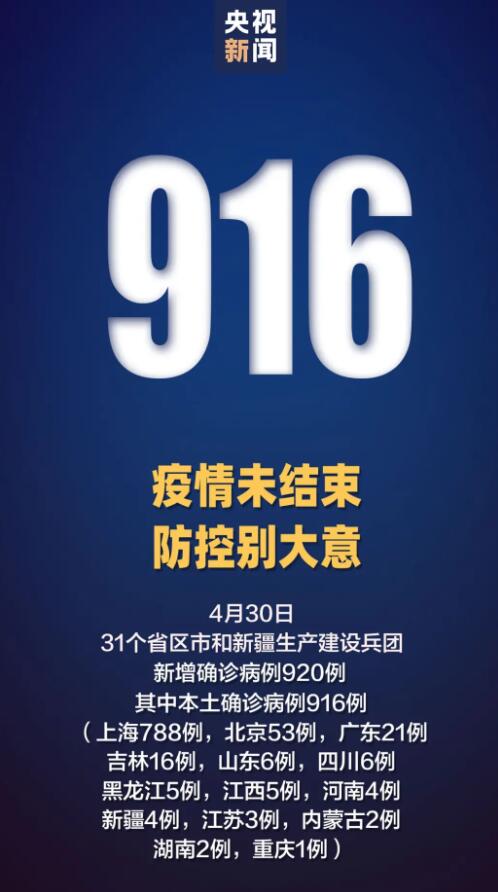 【国家卫健委:昨日新增本土确诊病例916例 本土无症状感染者7340例】4月30日0—24时,31个省(自治区、直辖市)和新疆生产建设兵团报告新增确诊病例920例。其中境外输入病例4例;本土病例916例(上海788例,北京53例,广东21例,吉林16例,山东6例,四川6例,黑龙江5例,江西5例,河南4例,新疆4例,江苏3例,内蒙古2例,湖南2例,重庆1例),含703例由无症状感染者转为确诊病例(上海683例,吉林11例,广东7例,山东1例,重庆1例)。新增死亡病例38例,均为本土病例,均在上海;无新增疑似病例。
