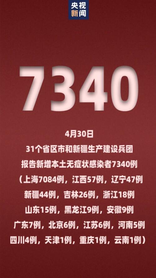 31个省(自治区、直辖市)和新疆生产建设兵团报告新增无症状感染者7409例,其中境外输入69例,本土7340例(上海7084例,江西57例,辽宁47例,新疆44例,吉林26例,浙江18例,山东15例,黑龙江9例,安徽9例,广东7例,北京6例,江苏6例,河南5例,四川4例,天津1例,重庆1例,云南1例)。