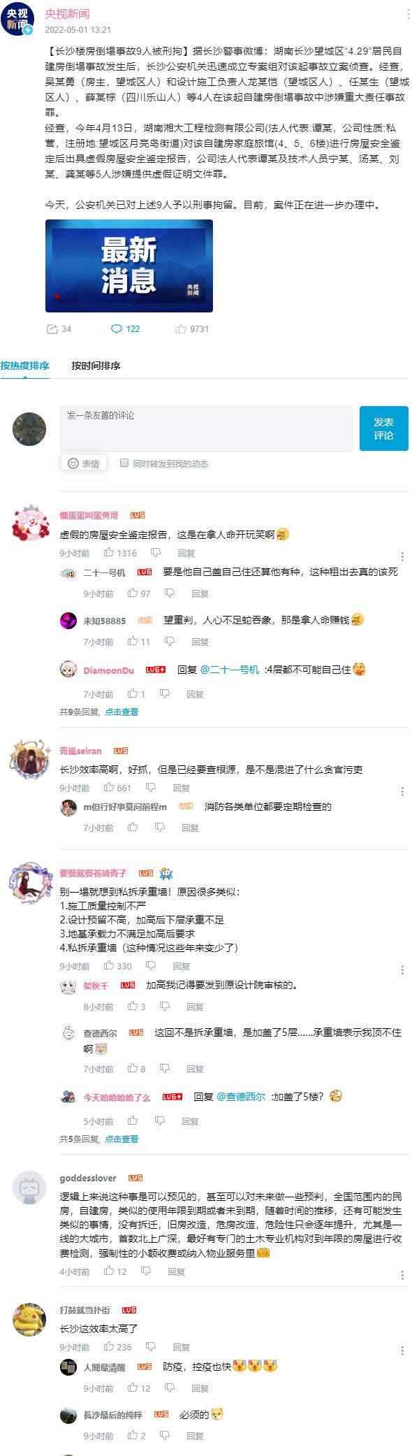 【长沙楼房倒塌事故9人被刑拘】据长沙警事微博:湖南长沙望城区“4.29”居民自建房倒塌事故发生后,长沙公安机关迅速成立专案组对该起事故立案侦查。经查,吴某勇(房主,望城区人)和设计施工负责人龙某恺(望城区人)、任某生(望城区人)、薛某棕(四川乐山人)等4人在该起自建房倒塌事故中涉嫌重大责任事故罪。