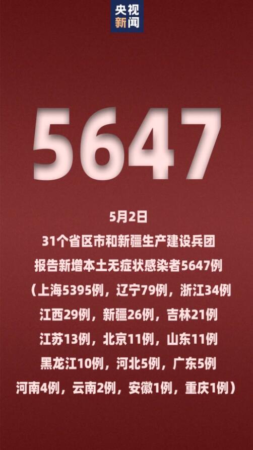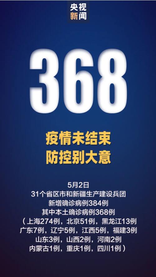 【国家卫健委:昨日新增本土确诊病例368例 本土无症状感染者5647例】5月2日0—24时,31个省(自治区、直辖市)和新疆生产建设兵团报告新增确诊病例384例。其中境外输入病例16例(福建6例,四川5例,广西3例,广东2例),含2例由无症状感染者转为确诊病例(均在福建);本土病例368例(上海274例,北京51例,黑龙江13例,广东7例,辽宁5例,江西5例,福建3例,山东3例,山西2例,河南2例,内蒙古1例,重庆1例,四川1例),含164例由无症状感染者转为确诊病例(上海155例,北京3例,辽宁2例,广东2例,山西1例,重庆1例)。新增死亡病例20例,均为本土病例,均在上海;新增疑似病例1例,为境外输入病例(在上海)。详情↓↓(总台央视记者 史迎春)