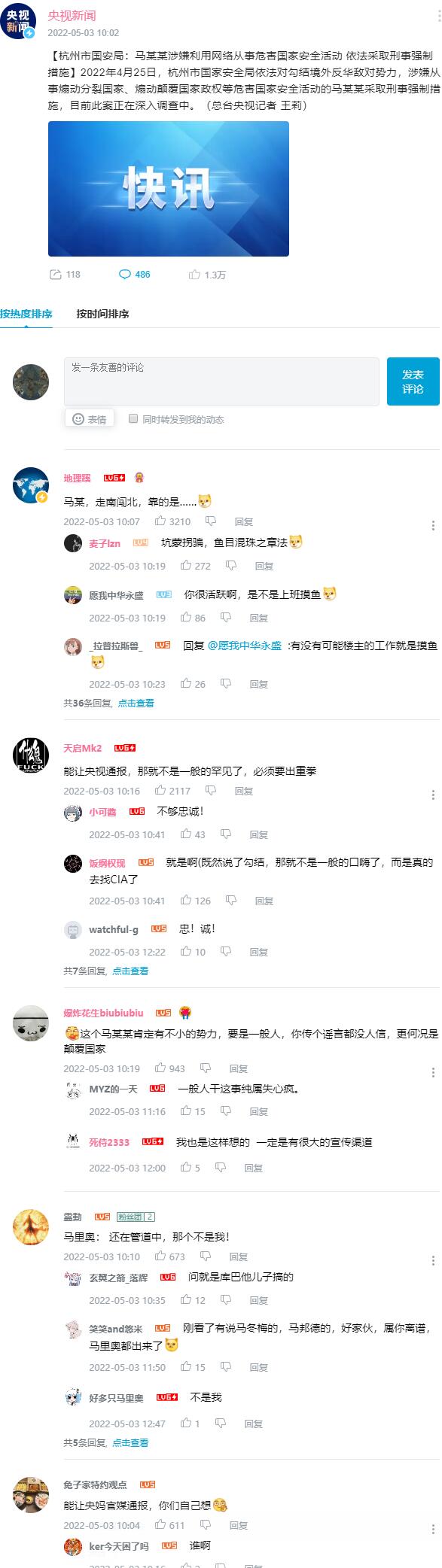★★★ 杭州市国安局:马某某涉嫌利用网络从事危害国家安全活动 依法采取刑事强制措施