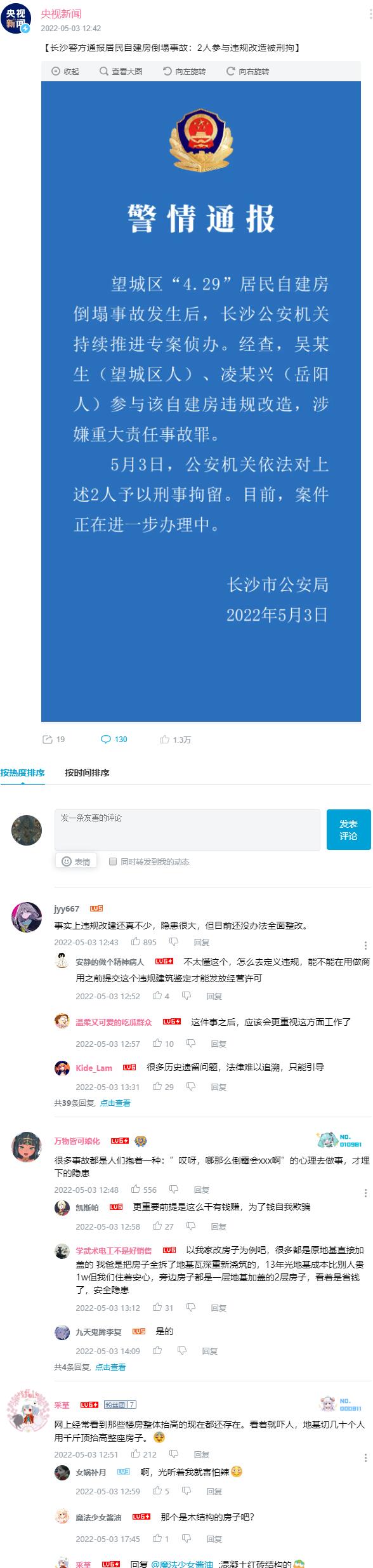 ★★★ 长沙警方通报居民自建房倒塌事故:2人参与违规改造被刑拘