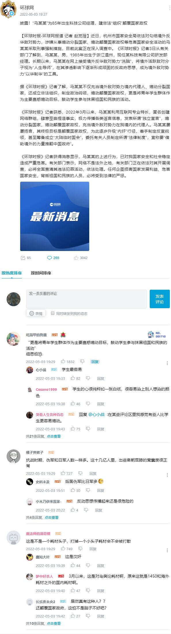 《环球时报》记者获悉,2022年3月以来,马某某利用互联网专业特长,匿名创建网络群组,肆意歪曲捏造事实,极力传播各类谣言信息,发表所谓“独立宣言”,煽动分裂国家、煽动颠覆国家政权,充当境外敌对势力在我境内的代理人。马某某屡屡扬言,其终极目标是颠覆国家政权,为此逐步升级“内奸”行径,着手制定反宣纲领,甚至筹备成立“大陆临时国会”,委托有关人员制定所谓“法律制度”,宣称要“借助境外的力量推翻中国政府”。